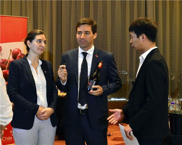智利駐華使館農業參贊古斯塔沃·弗朗茲(左二)和智利奧希金斯大區貿易促進局局長瑪利亞·索菲亞·西爾維婭(左一)現場推介當地高端葡萄酒Cerro Basalto 劉通 攝