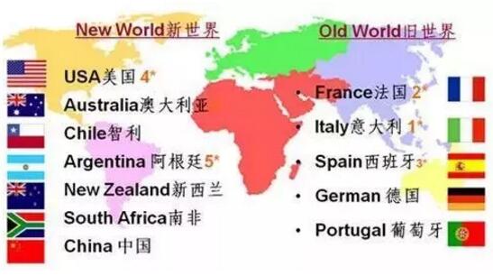 新世界:指來自除了歐洲之外的其他一些產葡萄酒的國家,包括美國、澳大利亞、南非、阿根廷、智利、中國、加拿大等國。
