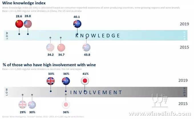 在主要市場中,澳大利亞和日本的葡萄酒市場在過去五年中增長最快。在日本,高參與度的葡萄酒消費者的比例已經從2015年的36%上升到2019年的41%,而澳大利亞高參與度的葡萄酒消費者比例從30%上升到36%。