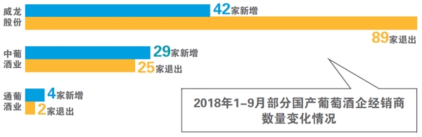 中信國安葡萄酒業股份在2018年1-9月新增經銷商29家,退出經銷商25家,較2017年年末微增4家。此外,中信國安葡萄酒業股份包含團購在內的直銷渠道銷售收入下跌了43.42%,批發代理及經銷商渠道的銷售收入則下跌了9.57%;通化葡萄酒股份的表現同樣不容樂觀,年末經銷商數量較2017年年末僅增加兩家,而從銷售收入上看,含團購的直銷渠道銷售收入大幅下滑38.05%,批發代理渠道銷售收入則大幅下滑30.79%。